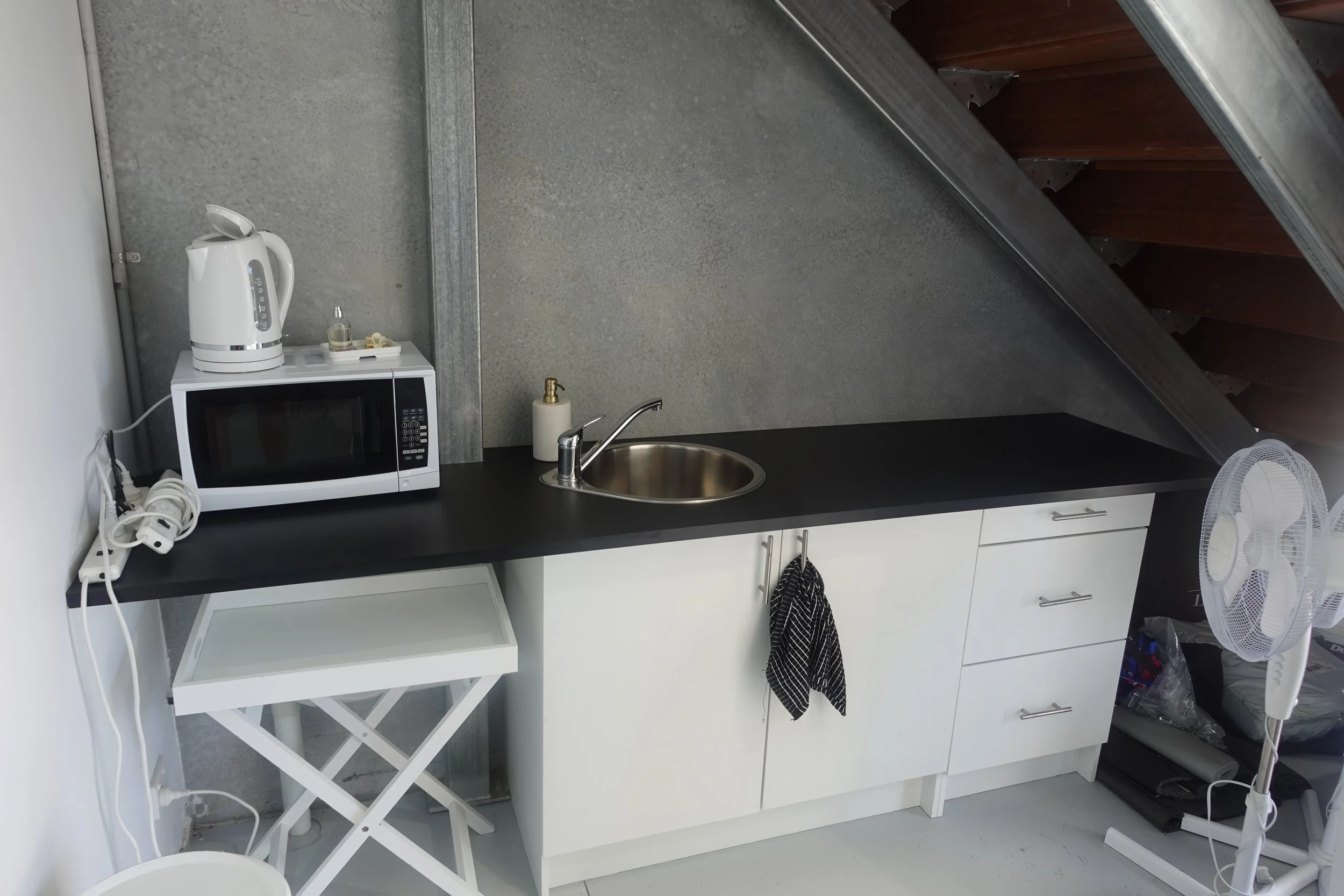Small kitchen area with black countertop, white cabinets, stainless steel sink, microwave, electric kettle, and soap dispenser. There is a black and white dish towel hanging on a cabinet handle. A small white folding table and a white standing fan are also present.