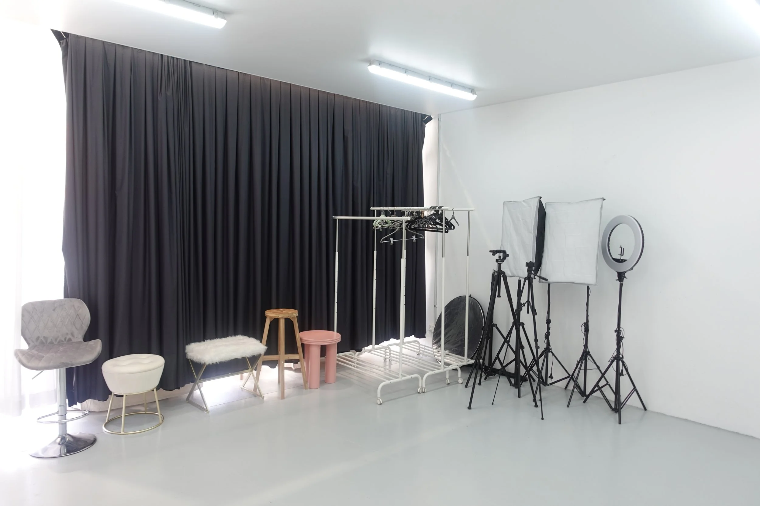 Photography studio with black curtains, chairs, a clothing rack, tripods, studio lights, and light reflectors.